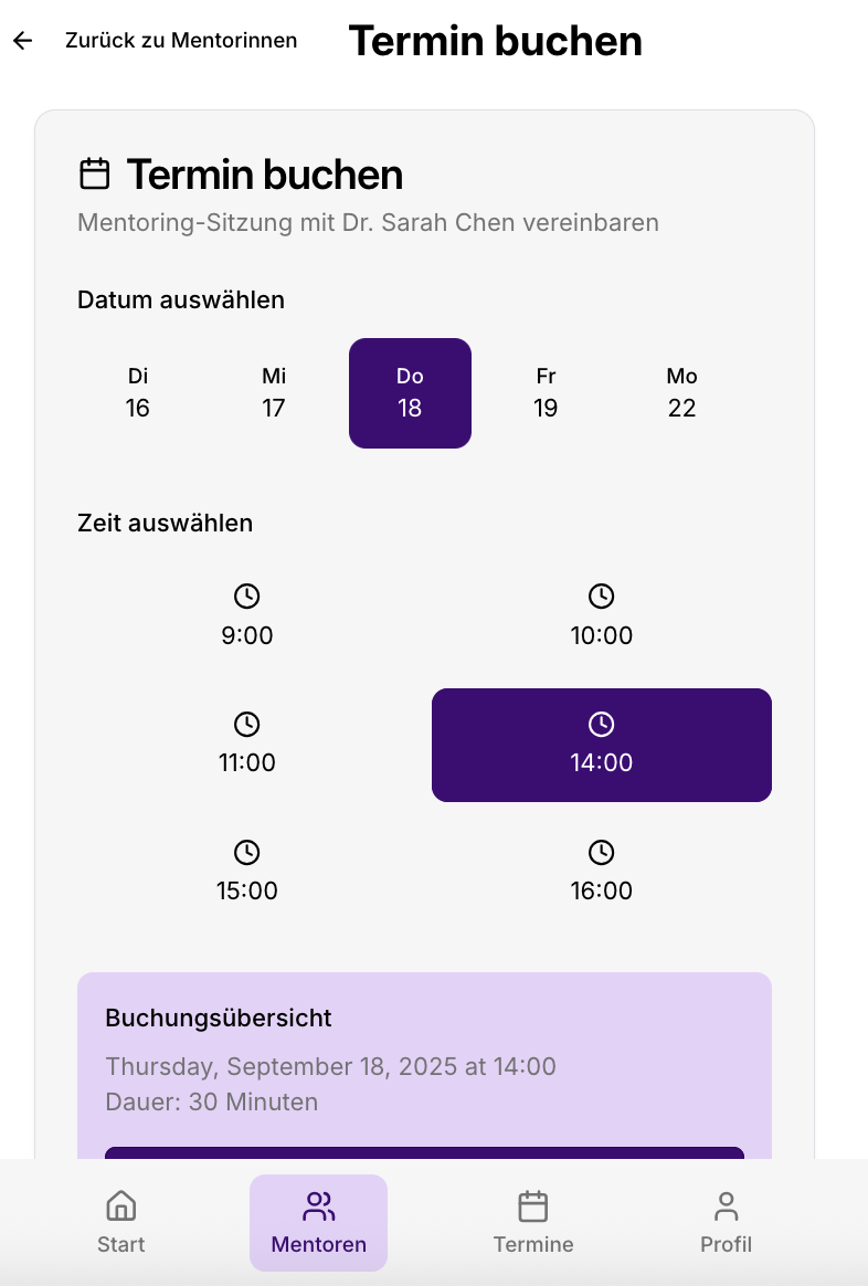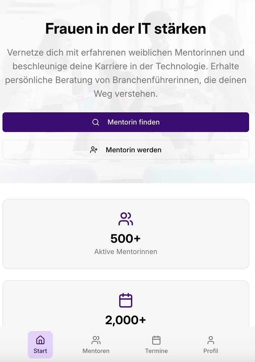 Für mein Vibe-Coding-Experiment habe ich mir das Grundkonzept von MentorHero geschnappt – ein UX/UI-Designprojekt aus meiner Weiterbildung zum UX-Designer. Ziel war keine 1:1-Übersetzung des bestehenden Designs, sondern die Kernidee technisch zum Leben zu erwecken: eine mobile-first Web-App, die junge Frauen mit Mentorinnen aus der IT verbindet, inklusive Terminbuchungsfunktion.
