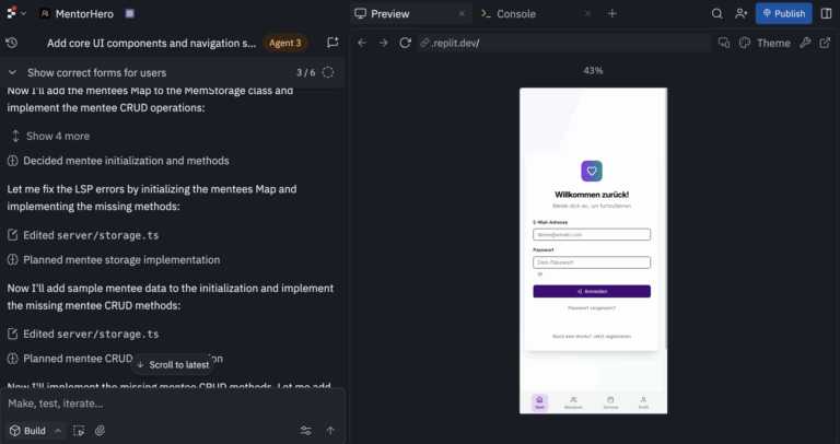 Meine erste Replit-Erfahrung mit Vibe Coding war mehr als ein technischer Test. Für mich hat sich gezeigt, dass dieser Ansatz eine echte Brücke zwischen Konzept und Umsetzung schlägt – besonders, wenn ein vorhandenes UX/UI-Projekt in die Praxis überführt werden soll.